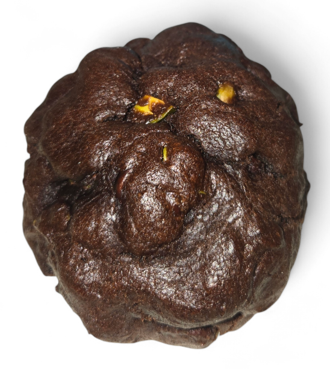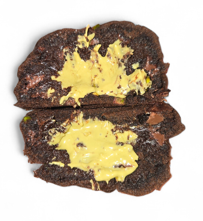 A sophisticated chocolate cookie filled with pistachio cream and toasted kataifi pastry, combined with spices (nutmeg and cardamom), pieces of toasted pistachios, and dark chocolate drops, an elegant, crunchy, creamy, and smooth treat.
